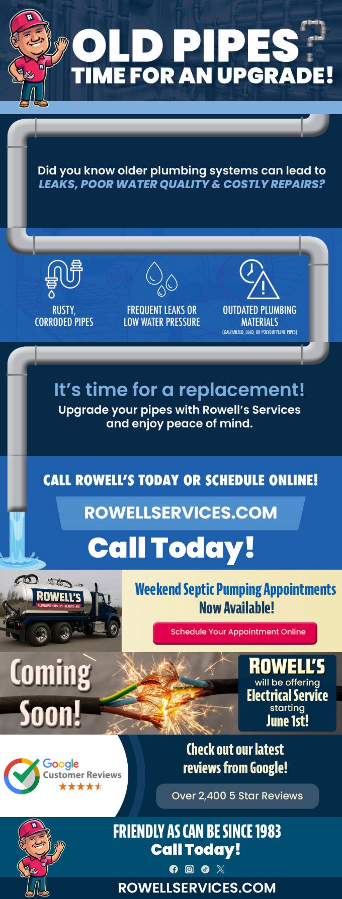It's time for a replacement! Upgrade your pipes with Rowell's Services and enjoy peace of mind.